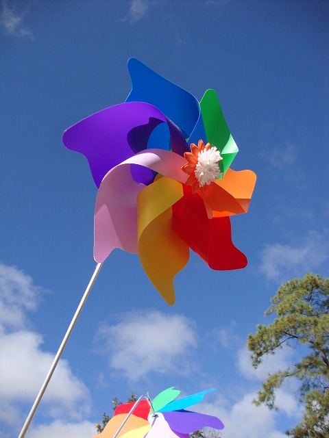 晴天の下、くるくる回るカラフルな風車キレイです。